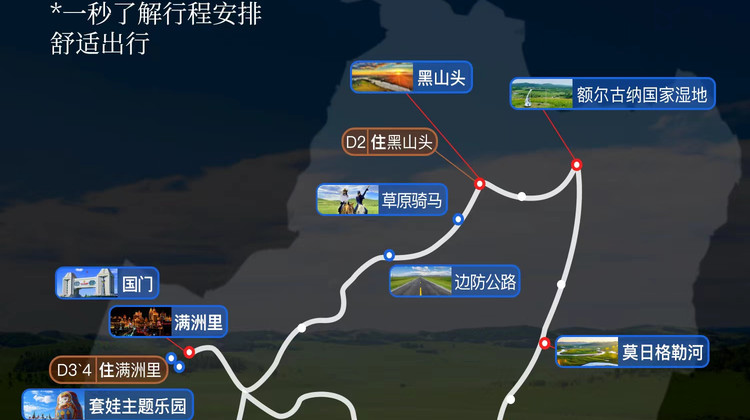 缤纷景点:🌈🌈🌈🌈🌈 ☘️莫日格勒河景区·九曲十八弯·赏呼伦贝尔大草原 🦌额尔古纳国家湿地+看萌宠驯鹿·无人机航拍留念 🐎草原在这里·滑草·8.6KM小火车+黑山头骑马·驰骋草原 🚶 6KM中俄边防公路·与俄罗斯仅仅相隔一条路 🚂国门景区+41号界碑+火车头广场+北疆明珠观光塔 🎪套娃主题乐园·暑期更有俄罗斯大马戏等着您嘞 中苏步行街+夜游北湖公园+北方人的海"呼伦湖" 🏇巴尔虎蒙古部落·看大型马上竞技表演《马之舞》