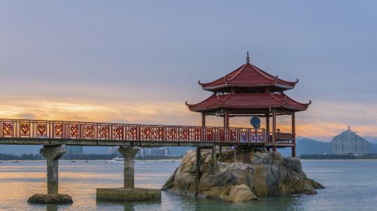 观音像位于海上的金刚洲上,一条280米长的普济桥将它与陆地相连接。
